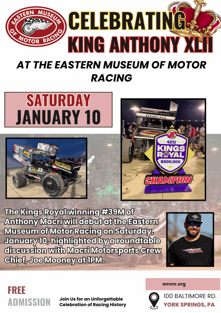 January 10: Celebrate King Anthony XLII at EMMR – the Kings Royal Winning #39M makes it debut plus roundtable discussion with crew chief, Joe Mooney at 1PM